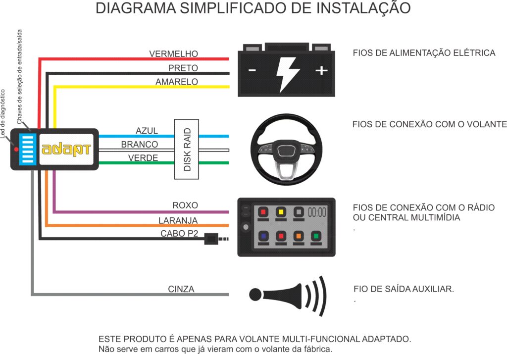 Além disso, ela comanda a iluminação das teclas, e tem uma saída auxiliar – que pode integrar buzina ou outras funções ao volante.